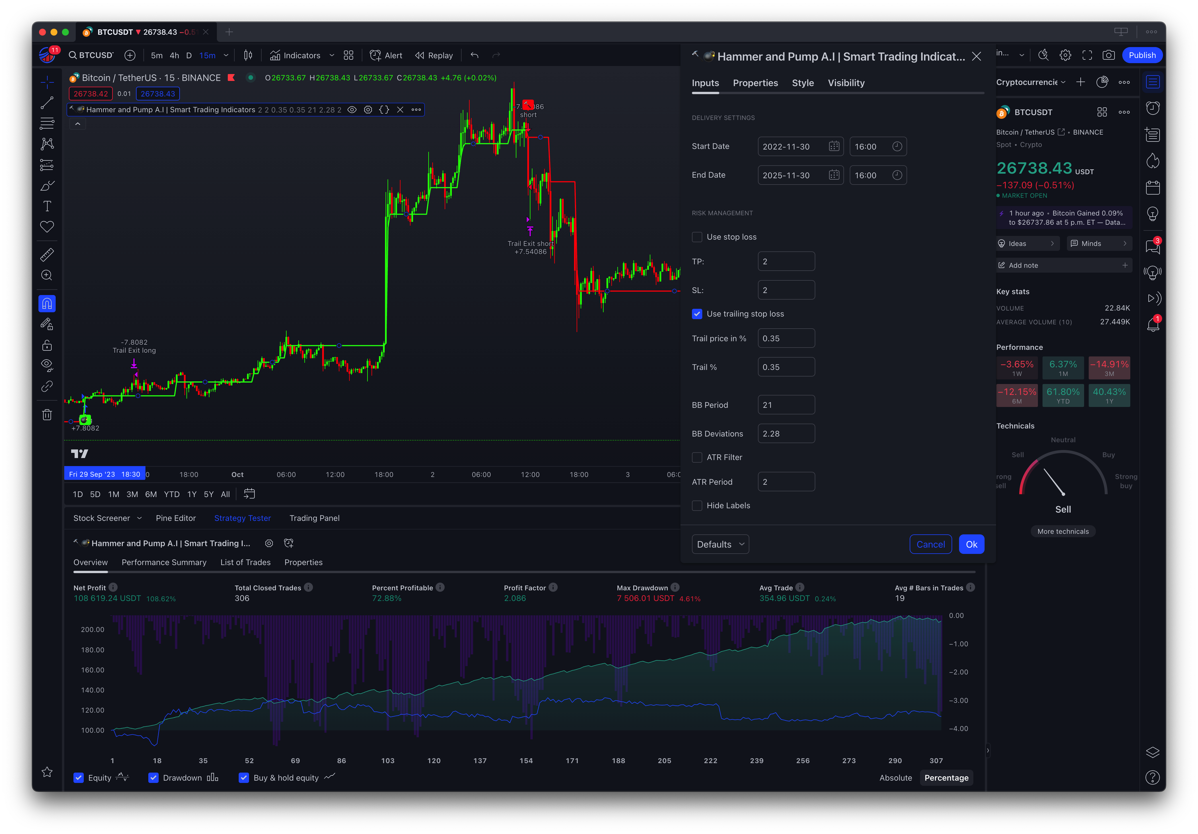# BTCUSD - 15m - 108.62% (Hammer And Pump)
