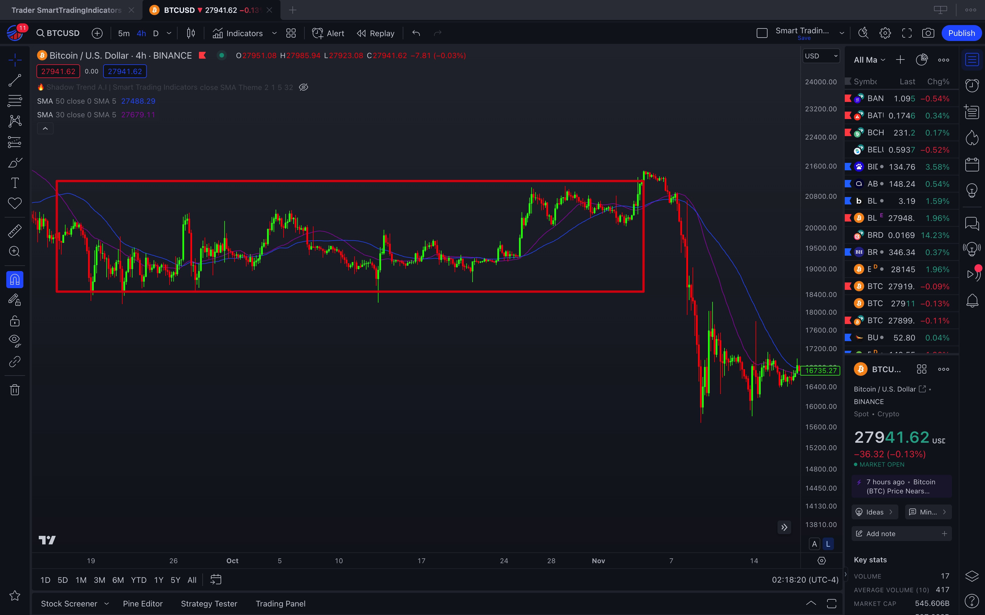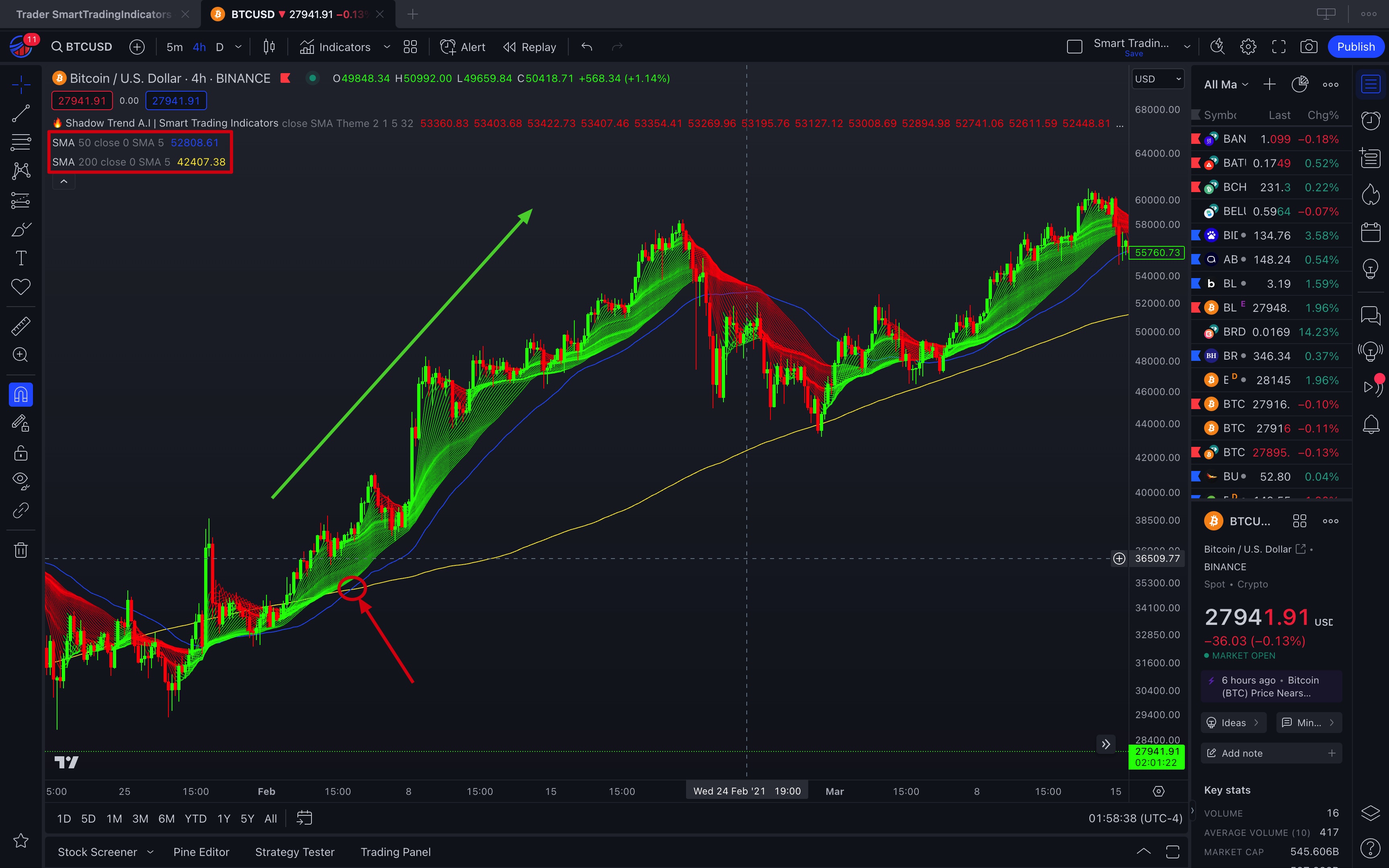 * **Description:** Presents a candlestick chart with a 50-period EMA that changes color. The EMA line could change from green to red when candle prices fall below the EMA.
